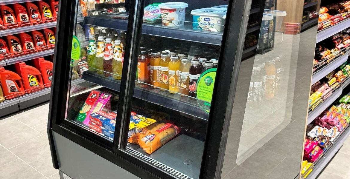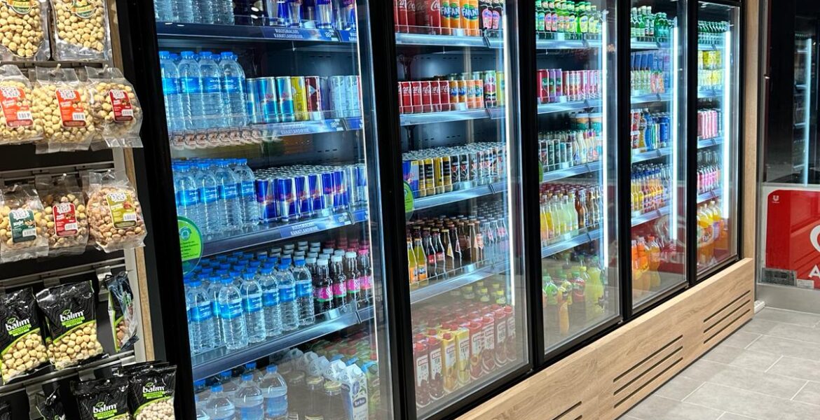 Petrol Ofisi istasyonlarında kullanılan dıştan motorlu çarpma kapılı şişe dolabı